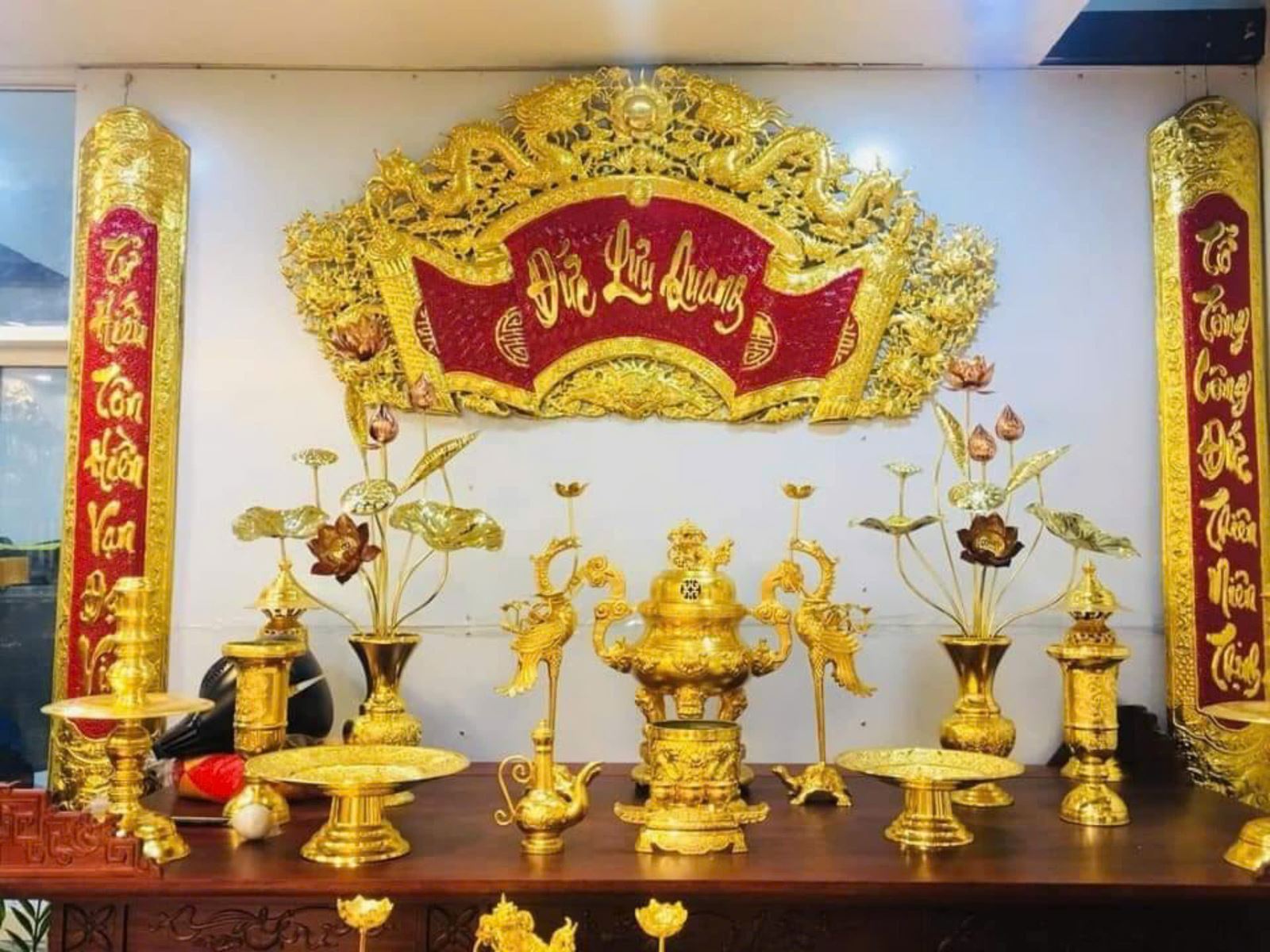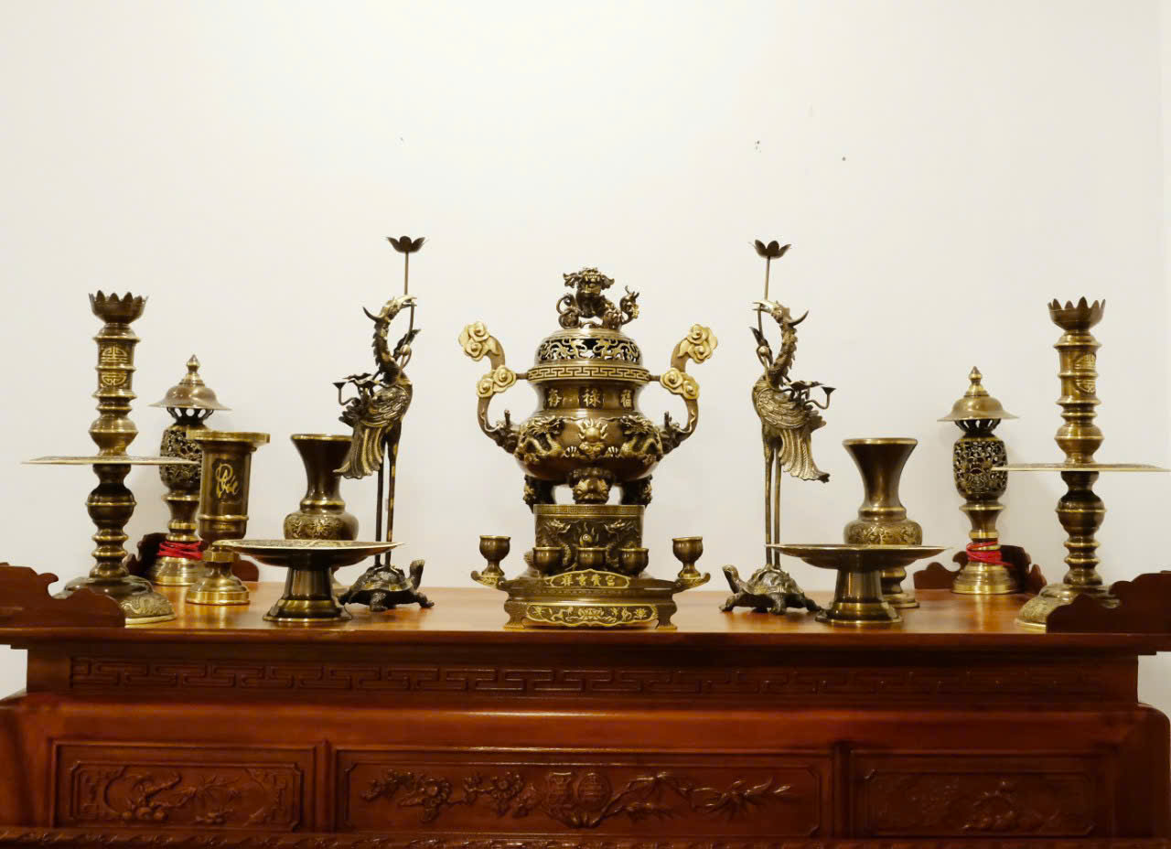- Bàn thờ lớn: Lựa chọn bộ đỉnh đồng có kích thước lớn, đi kèm các phụ kiện như hạc đồng, chân nến.