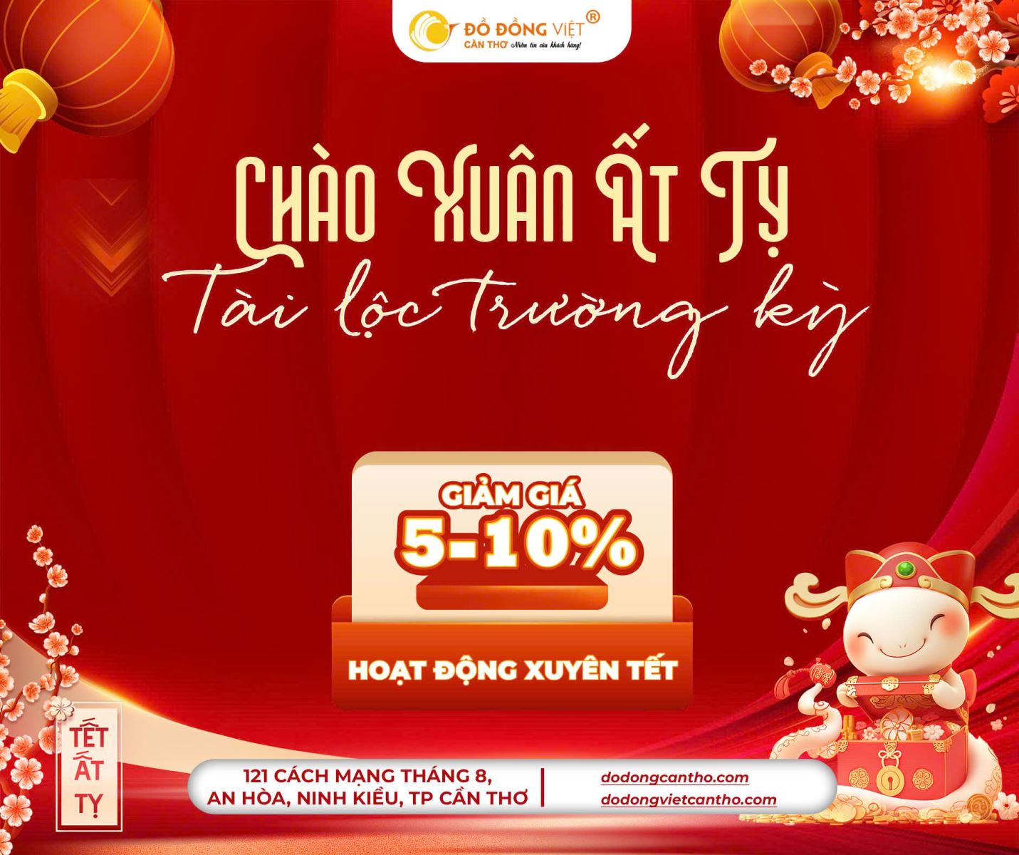 Chào xuân Ất Tỵ, Đồ Đồng Việt Cần Thơ xin gửi lời chúc tốt đẹp nhất đến quý khách hàng và đối tác. Cùng với những lời tri ân chân thành, chúng tôi hân hạnh mang đến chương trình khuyến mãi hấp dẫn và hoạt động xuyên Tết để phục vụ quý khách hàng tốt nhất. Hãy cùng tìm hiểu chi tiết về các ưu đãi và hoạt động dịp Tết này!