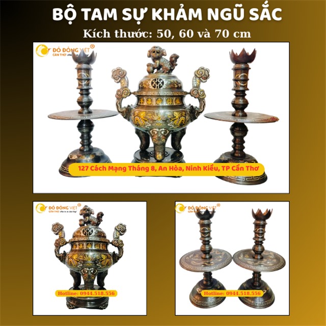 Để đáp ứng nhu cầu đa dạng của quý khách hàng, chúng tôi cung cấp các bộ tam sự với nhiều mẫu mã, kiểu dáng và kích thước khác nhau. Từ những bộ tam sự đơn giản, trang nhã phù hợp với bàn thờ chung cư, đến những bộ tam sự chạm khắc tinh xảo, hoành tráng cho bàn thờ gia tiên truyền thống hay nhà thờ họ. Bạn có thể lựa chọn theo phong cách đồng vàng bóng, đồng hun giả cổ, hoặc đồng khảm ngũ sắc rực rỡ, đảm bảo tìm được sản phẩm ưng ý nhất cho nội thất phòng thờ.