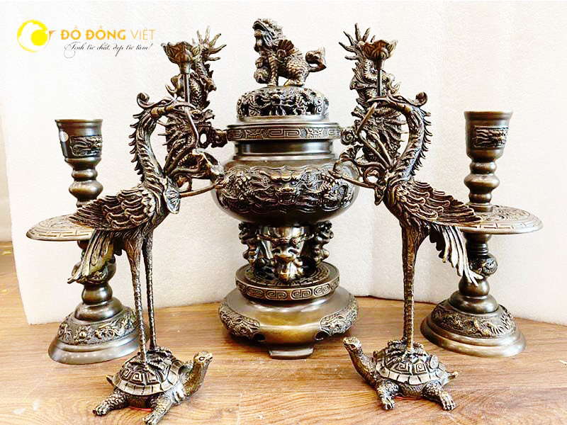 Cũng tương tự bộ lư đồng dapha ngũ sự bao gồm 1 đỉnh, 2 nến và 2 hạc.