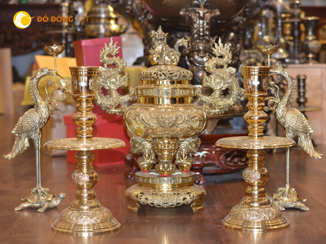 Cũng tương tự bộ lư đồng vĩnh tiến ngũ sự bao gồm 1 đỉnh, 2 nến và 2 hạc.