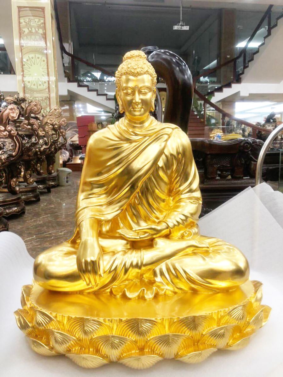– Tượng Phật mạ vàng – dát vàng 9999: Nguyên liệu đồng đỏ hoặc đồng vàng với quy trình sản xuất đúc thủ công hoặc đúc máy. Bề mặt được mạ vàng 24k bằng công nghệ điện phân hoặc được dát vàng quỳ 9999 rất sáng, đẹp và đẳng cấp.