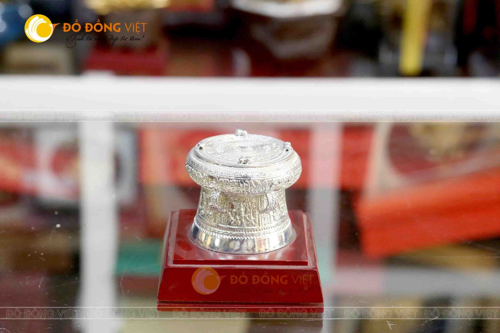 Bộ trống đồng mạ bạc gồm: Trống đồng, đế gỗ gắn nền nhung đỏ, hộp mica, hộp đựng lót lụa sang trọng. Chúng tôi nhận mạ vàng, mạ bạc các loại trống đồng theo yêu cầu. Cung ứng trống đồng quà tặng cho doanh nghiệp.