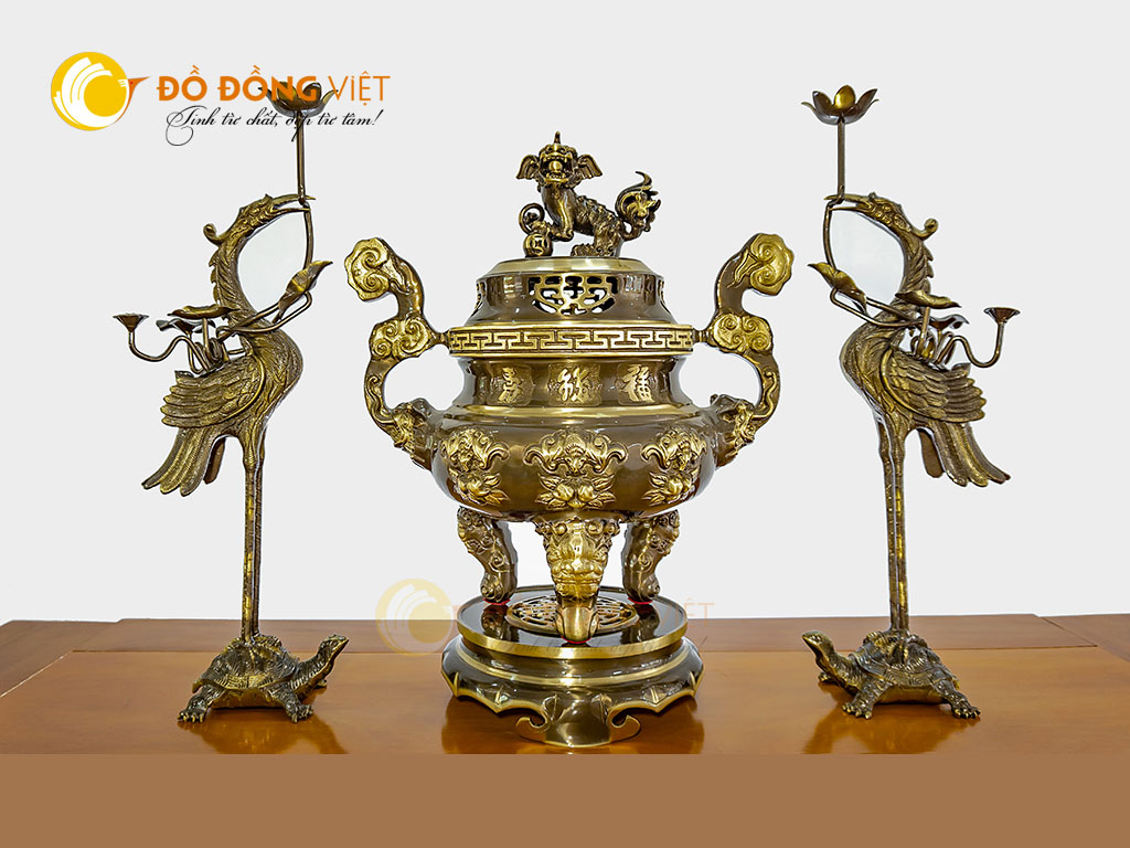 - Đỉnh đồng đặt chính giữa, lui về sau trên ban thờ. 2 bên là đôi hạc hoặc đôi chân nến. Nếu là hạc thì đặt hướng quay đầu chầu vào đỉnh thờ.