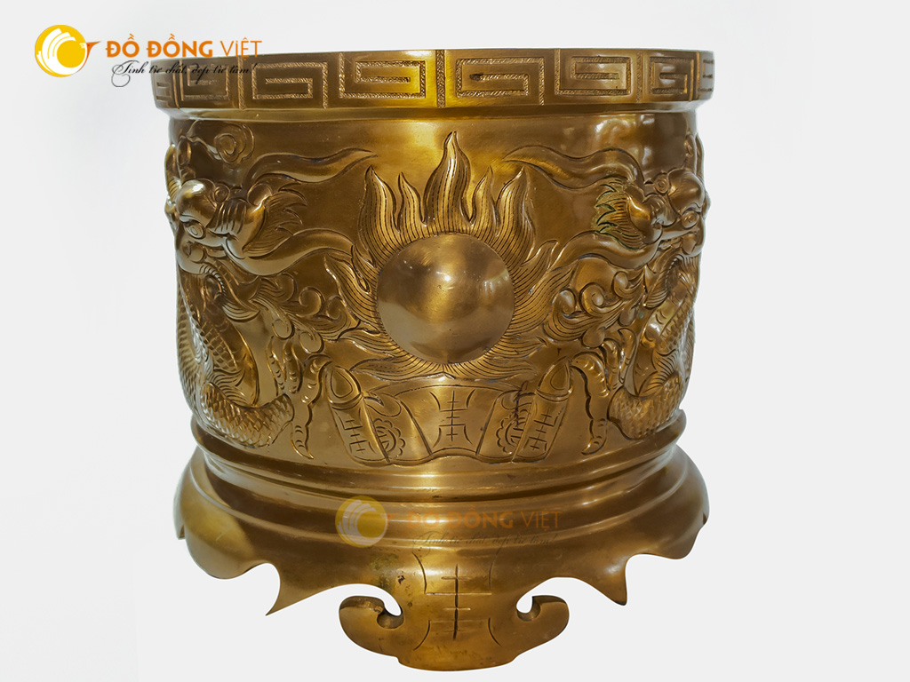 Sản phẩm bát hương đồng có dạng hình trụ. Trong đó miệng bát có đường viền gờ nổi dày dặn bao quanh. Chi tiết này được để mộc, không sử dụng hoa văn trang trí. Ở thân bát, người nghệ nhân đã chạm nổi vầng nguyệt ở giữa. Bên trong nó có hai nửa âm dương cân bằng, bên ngoài là ánh sáng tỏa ra. Ở hai bên có đôi rồng chầu vào. Chúng đứng trên những áng mây, tạo nên vẻ đẹp huyền thoại.