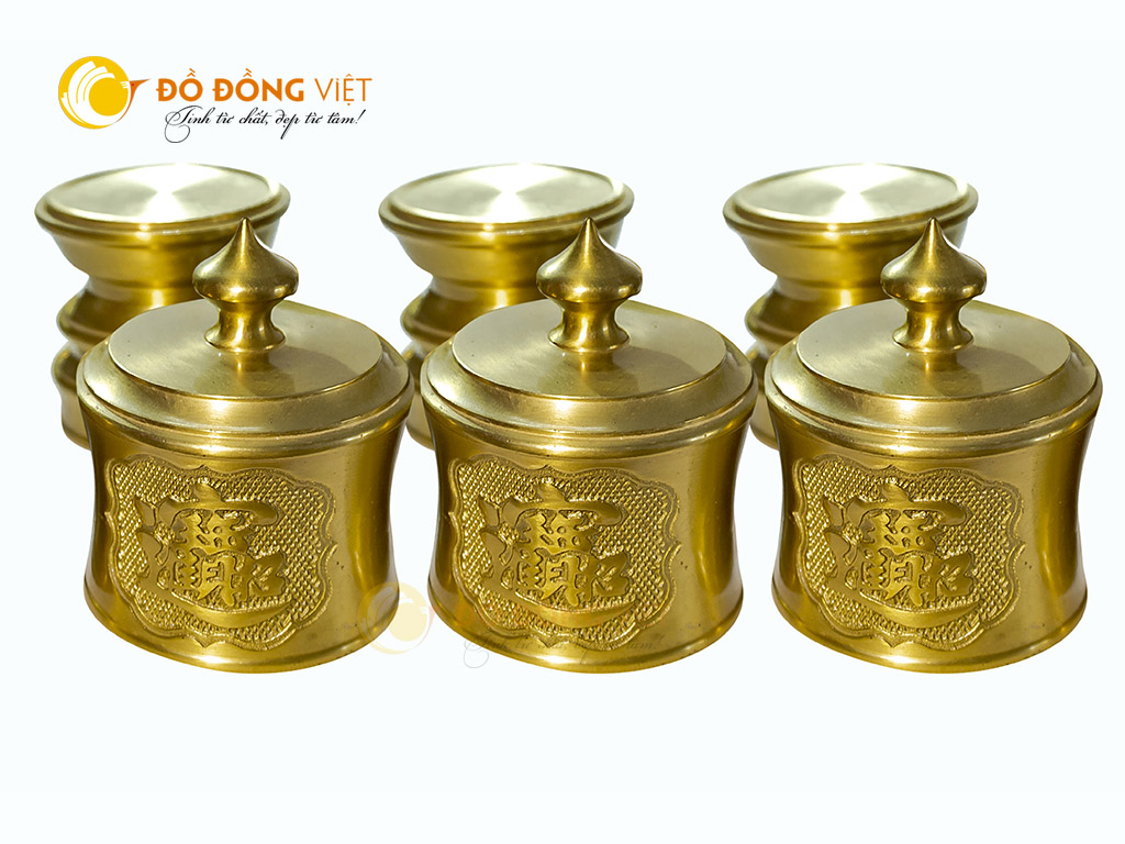 Bộ đài thờ bằng đồng bao gồm hai bộ phận chính là phần nắp chụp và phần chân đế. Phần trên cùng của đế lõm lại, có tác dụng cố định những chiếc cốc đựng nước thờ (ngoài ra có thể là rượu hoặc muối). Ngay bên dưới có một trục hình trụ cùng các bậc xếp chồng lên nhau, tạo thế đứng vững vàng, chắc chắn. Những đường viền gờ nổi giúp vẻ đẹp của sản phẩm càng thêm ấn tượng.