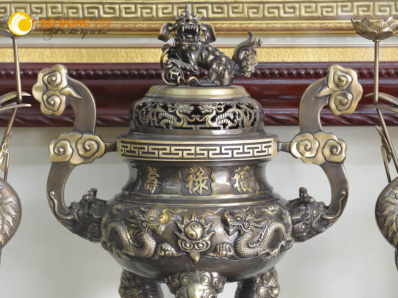 Bộ ngũ sự đỉnh đồng được chế tác bởi quy trình làm việc chuyên nghiệp, khoa học, sử dụng chất liệu cao cấp. Bên cạnh đó là sự tham gia của các nghệ nhân nổi tiếng đến từ làng nghề truyền thống. Khi quan sát sản phẩm, các bạn sẽ thấy màu sắc vô cùng đặc biệt. Bên cạnh những chi tiết có màu hun đen giả cổ thì còn có những nét điểm xuyết ánh kim của đồng vàng nguyên chất. Đây là sự kết hợp hài hòa và ấn tượng, tạo nên sự trang trọng cho không gian thờ tự.