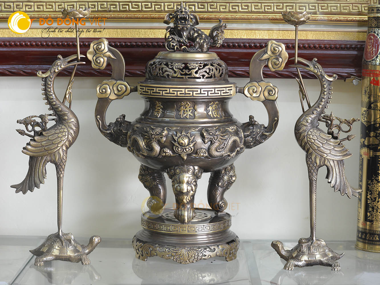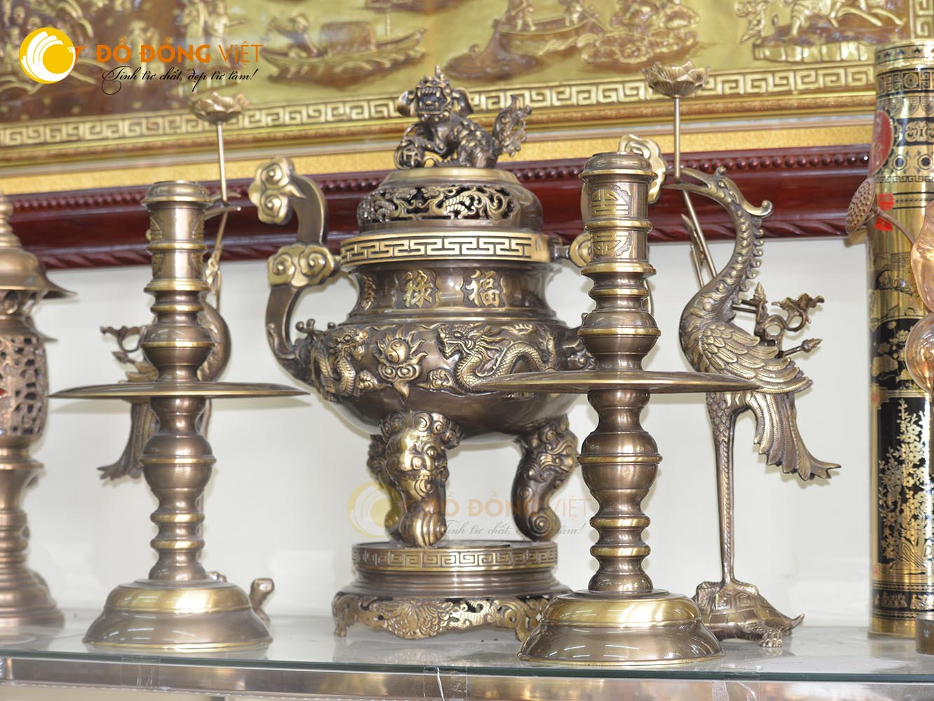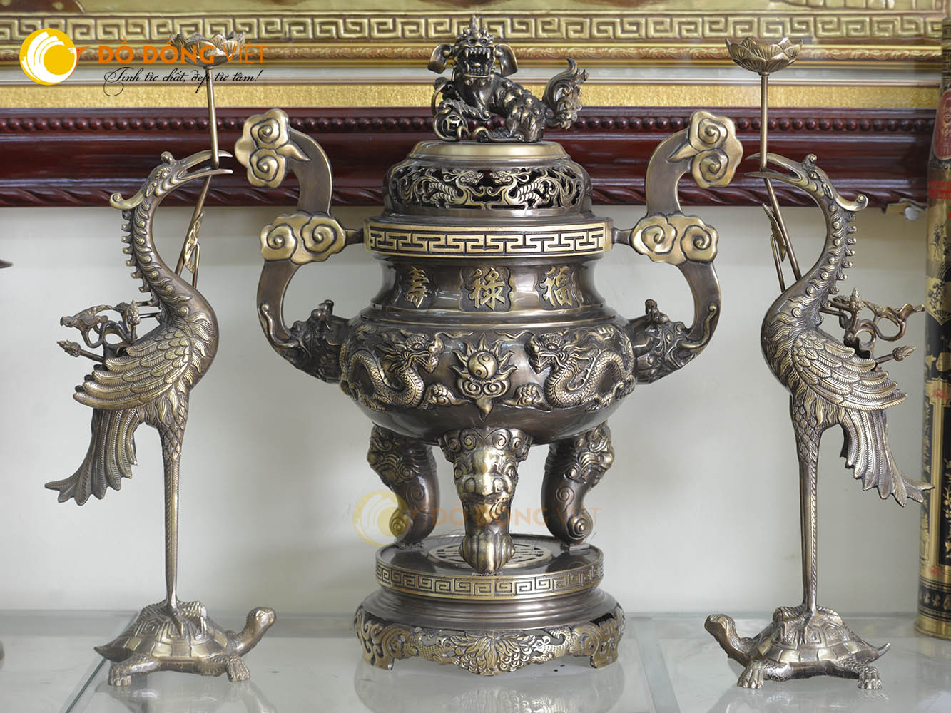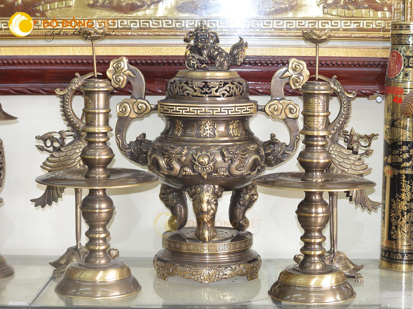 Đỉnh đồng thờ cúng đẹp và chất lượng là sản phẩm đồ thờ của gia đình Việt. Trên bàn thờ gia tiên, sự xuất hiện của bộ đồ thờ ngũ sự bằng đồng hun giả cổ song long chầu nguyệt mang đến công năng phong thủy dồi dào. Trong đó, mẫu sản phẩm có chiều cao 70cm được nhiều gia đình lựa chọn và sử dụng.