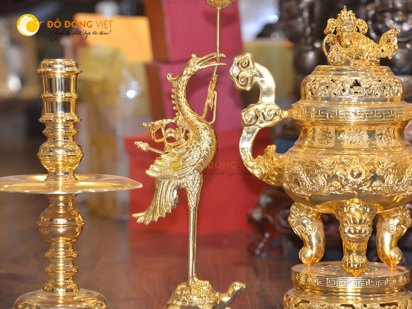Bộ đồ thờ cúng tam sự đỉnh đồng phú quý dát vàng 24k