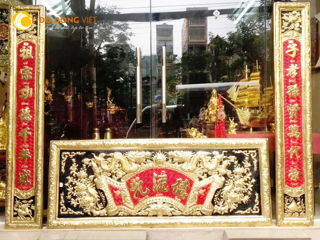 Câu đối: Ở đây, sản phẩm bo góc và mỗi đầu được tô điểm bởi hình ảnh của Tứ linh (Long - Lân - Quy - Phụng). Nội dung được thể hiện trên đôi câu đối là: