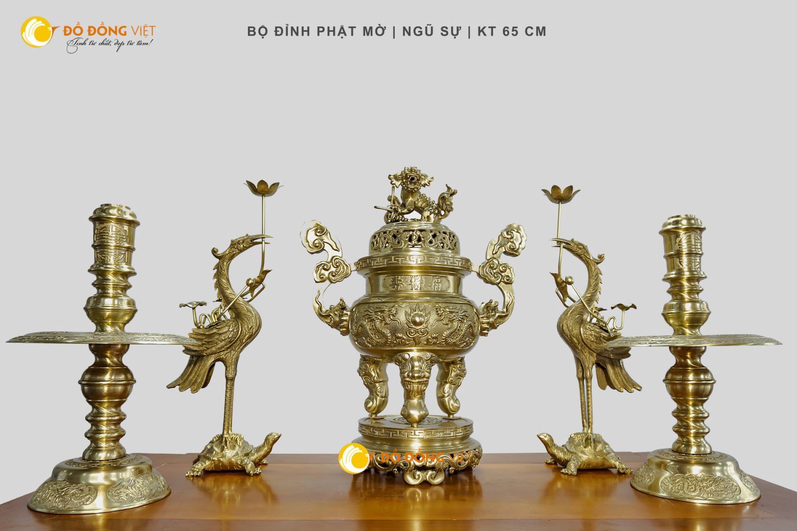 Bộ đỉnh đồng vàng 3D thờ cúng bộ ngũ sự là bộ sản phẩm gồm 5 món, bao gồm: 1 đỉnh đồng, 2 hạc thờ bằng đồng và 2 chân nến đồng. Bộ đỉnh đồng ngũ sự được đúc 100% từ đồng vàng cao cấp. Sản phẩm nổi bật bởi thiết kế đẹp mắt, khe thoáng có hình chữ Thọ triện được chạm một cách tỉ mỉ, khéo léo. Phía trên cùng có bức tượng Kỳ Lân thiêng liêng trong tư thế chân vờn cầu, miệng há rộng. Thân đỉnh phình rộng với bề mặt của nó cực kỳ cuốn hút cùng hình ảnh bông hoa sòi. Thế chân vạc giúp đỉnh có dáng đứng bệ vệ. Bệ đỡ của sản phẩm được chạm chữ Thọ tròn. Tùy vào kích thước của bàn thờ mà có thể lựa chọn giữa hai bộ đỉnh đồng thờ cúng này sao cho hợp lý nhất.