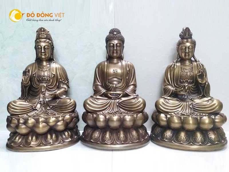 Bộ tượng tam thế Phật bằng đồng vàng hun giả cổ cao 60cm