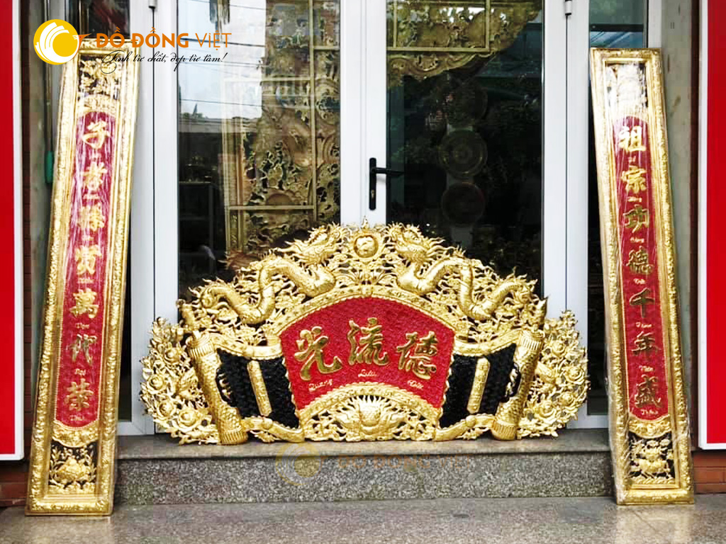 Cuốn thư câu đối bằng đồng vàng nền đỏ KT 1m76