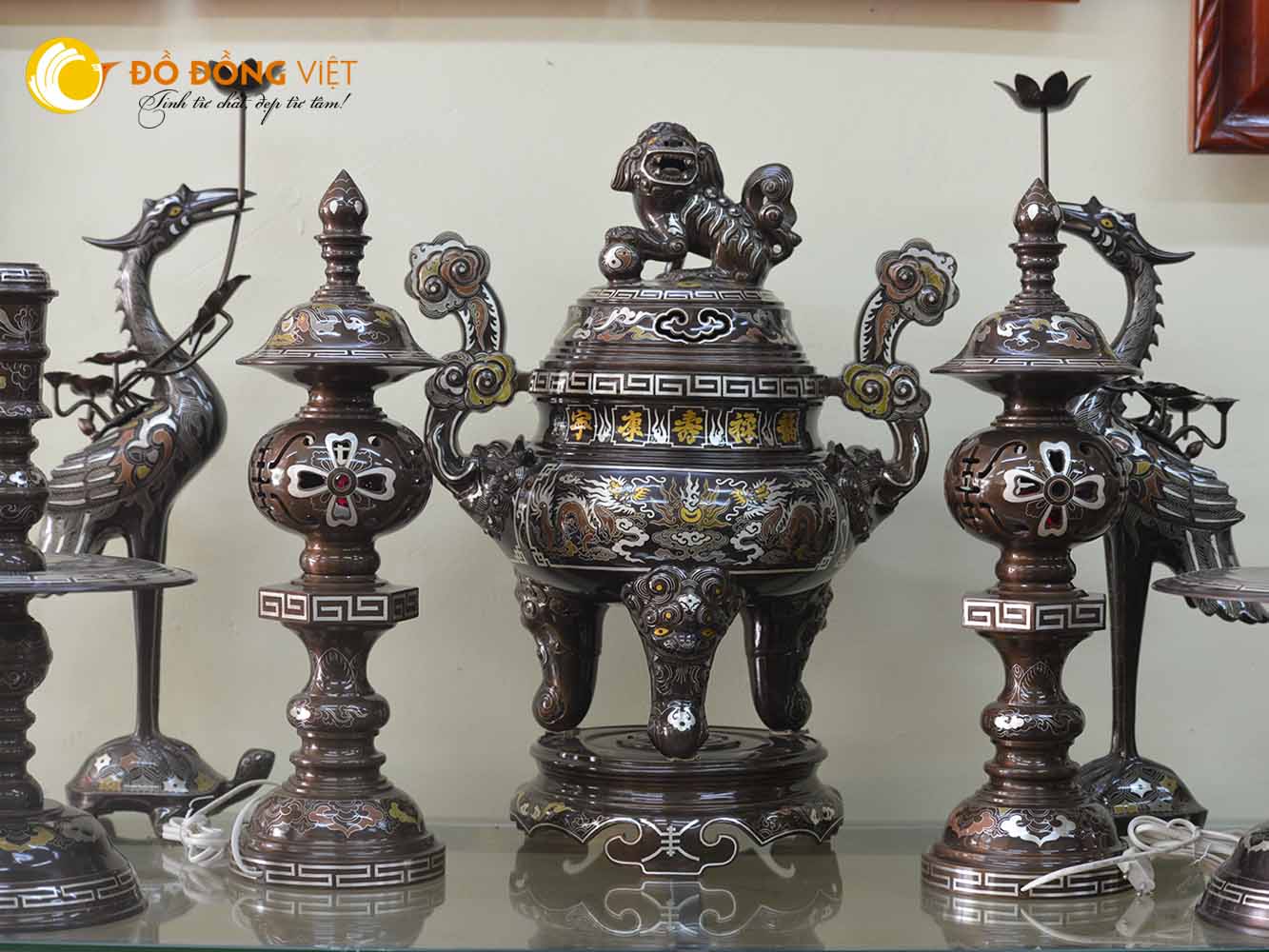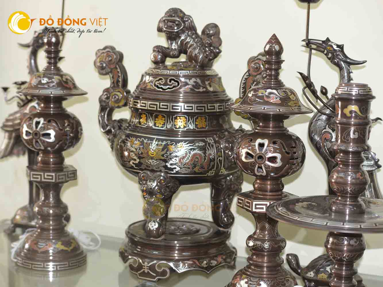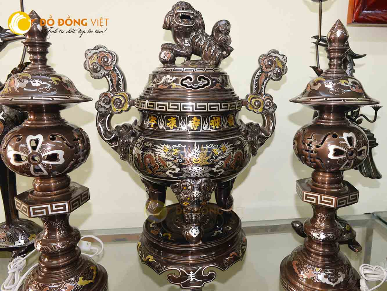 Bộ đỉnh đồng khảm ngũ sắc ngũ sự bằng đồng đỏ khảm ngũ sắc cao 70cm cổ kính cao cấp của Đồ đồng Việt là bộ đồ thờ cúng tinh xảo, mang giá trị truyền thống sâu sắc rất được ưa chuộng.