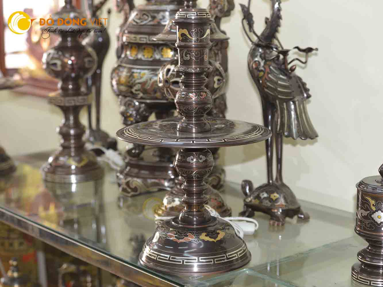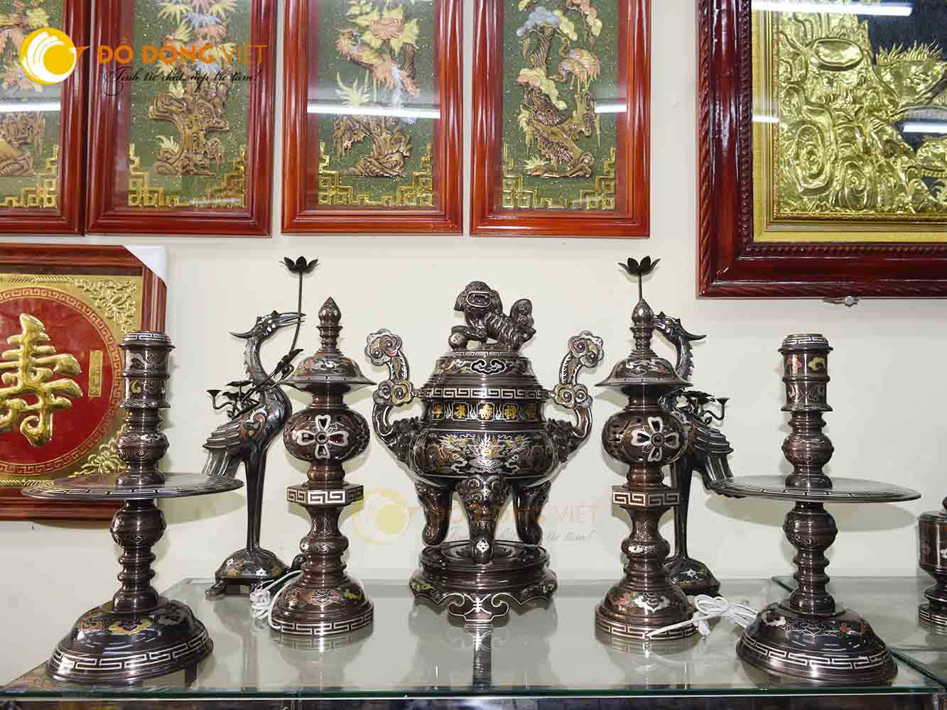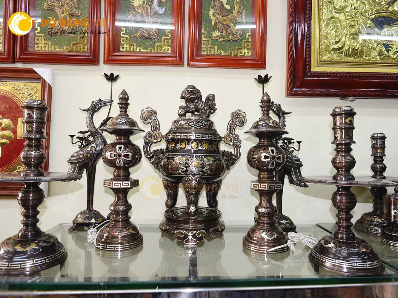 Bộ đỉnh đồng khảm ngũ sắc ngũ sự bằng đồng đỏ khảm ngũ sắc cao 70cm cổ kính cao cấp của Đồ đồng Việt là bộ đồ thờ cúng tinh xảo, mang giá trị truyền thống sâu sắc rất được ưa chuộng.