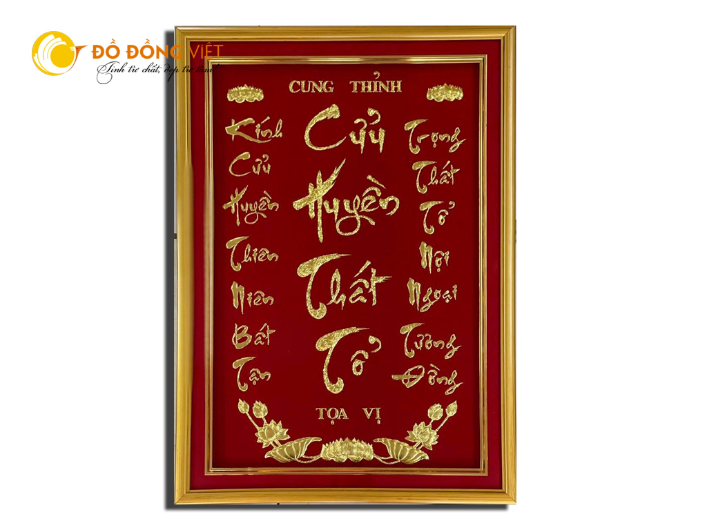 Trên bức bài vị Cửu huyền thất tổ có các họa tiết như song long trầu nguyệt, các chữ viết hán nôm và chữ viết quốc ngữ thư pháp dịch nghĩa. Tất cả các họa tiết đều được thúc nổi tỉnh xảo dưới bàn tay của nghệ nhân Đồ đồng Việt. Trên bức tranh đồng thuộc loại sơn son chữ vàng, bên trên có đề dòng chữ nổi “Cửu hyền thất tổ”; 2 bên là bộ câu đối “Kính Cửu Huyền Thiên Niên Bất Tận – Trọng Thất Tổ Nội Ngoại Tương Đồng