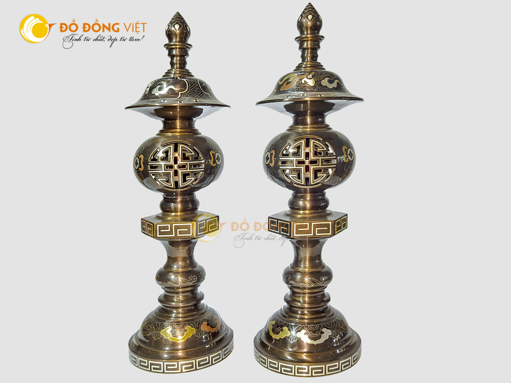 Đôi đèn thờ, cúng cao cấp khảm ngũ sắc. Đôi Đèn Thờ Cúng Khảm Ngũ Sắc - chất liệu đúc từ đồng đỏ tinh khiết, khảm ngũ sắc; màu vàng của vàng 9999, màu trắng của bạc lá, màu đỏ của đồng đỏ, xanh của đồng xanh và màu đồng đen.