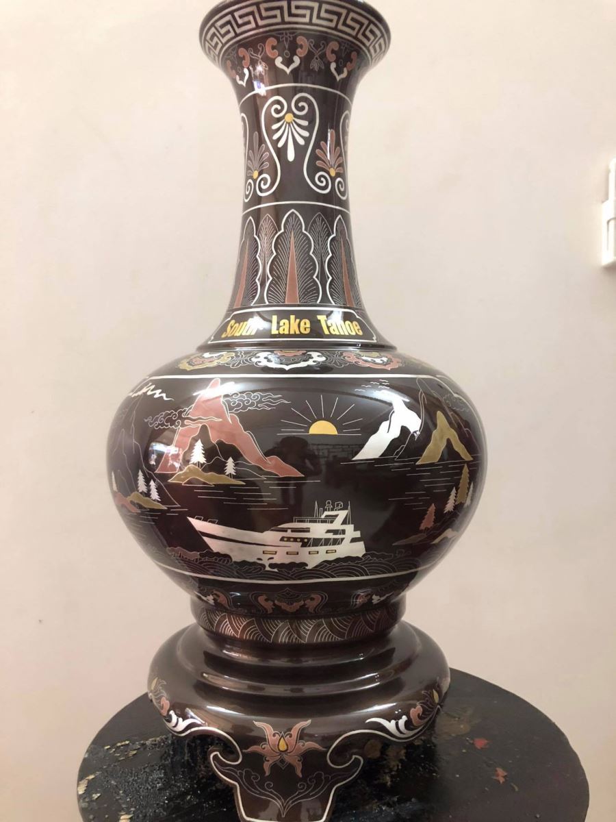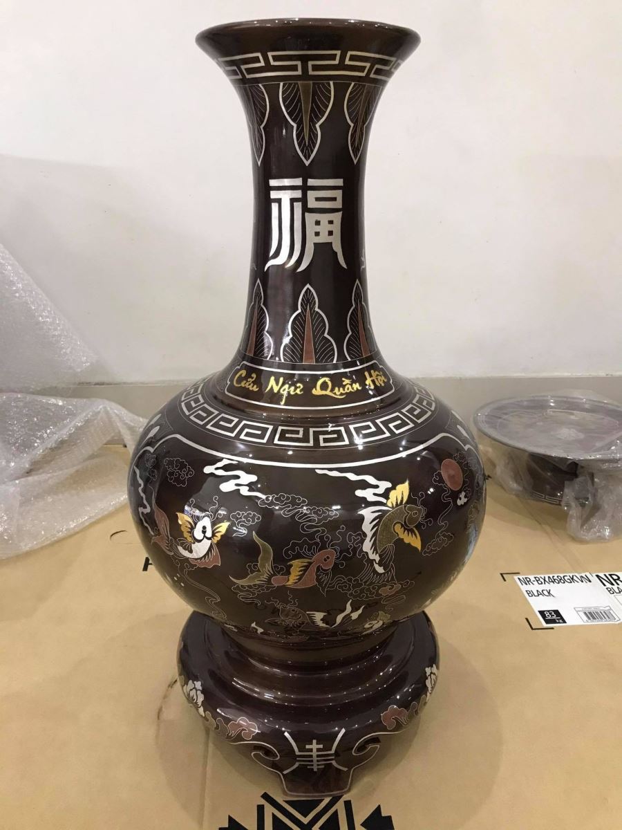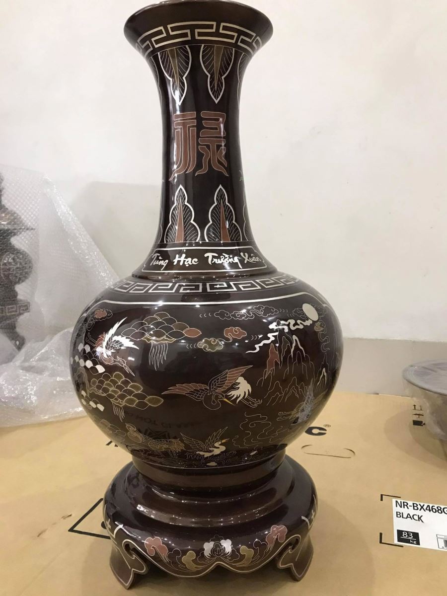 Lọ hoa thờ cúng bằng đồng khảm ngũ sắc được Đồ đồng Việt đúc thủ công bằng đồng đỏ, khảm ngũ sắc năm màu cơ bản, tạo nền trên đôi lọ lục bình của 3 kim loại chính ” vàng, bạc, đồng đỏ, đồng vàng, đồng xanh, đồng đen.
