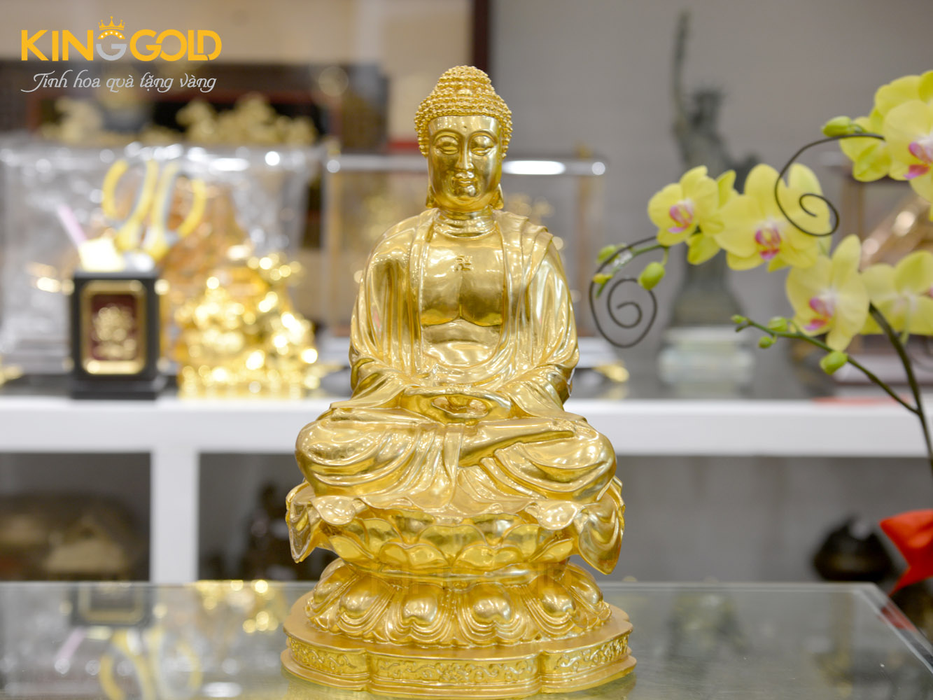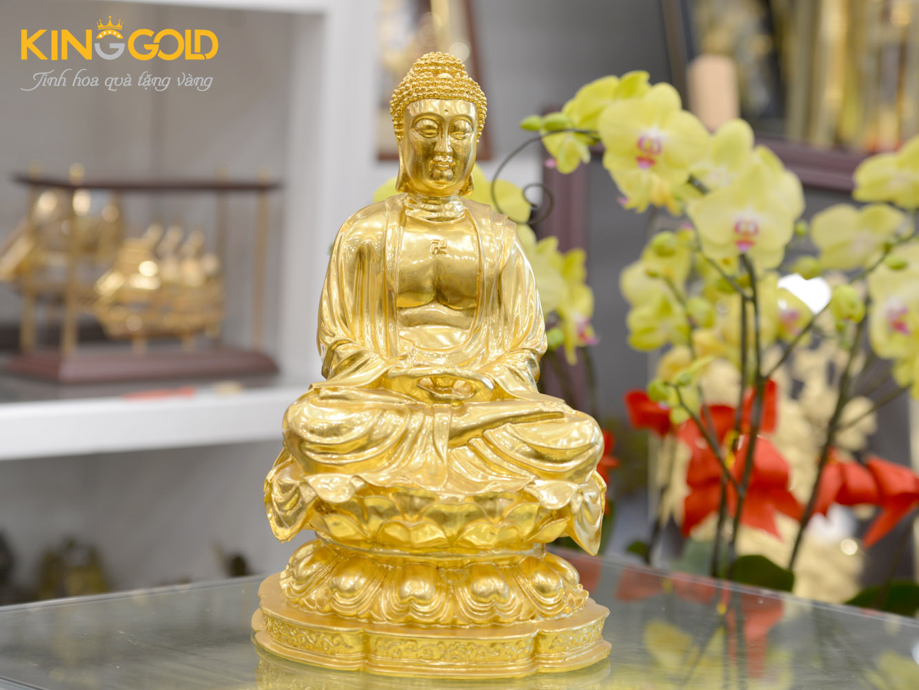 Vẻ đẹp thiêng liêng của tượng Phật càng được khắc họa sâu hơn với hình thức thếp vàng. Bề mặt sản phẩm nhẵn mịn và tỏa ra ánh kim rực rỡ tựa như hào quang. Chất liệu vàng tinh khiết vừa bắt mắt, thu hút; vừa có khả năng chống ăn mòn hiệu quả. Tượng được đặt trên một đế hoa sen chạm hoa văn tinh xảo. Điều này thể hiện sự tôn kính và trân trọng.