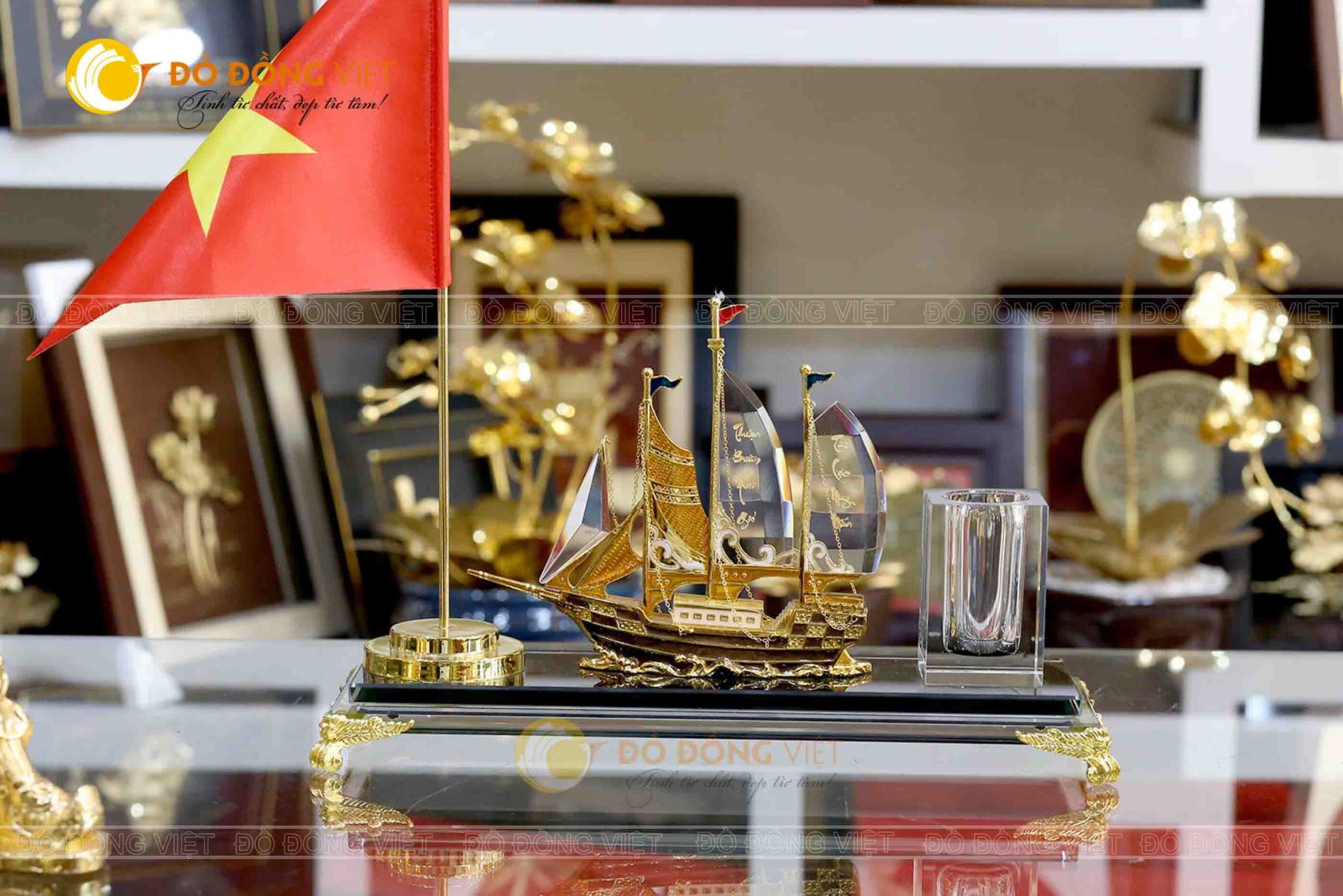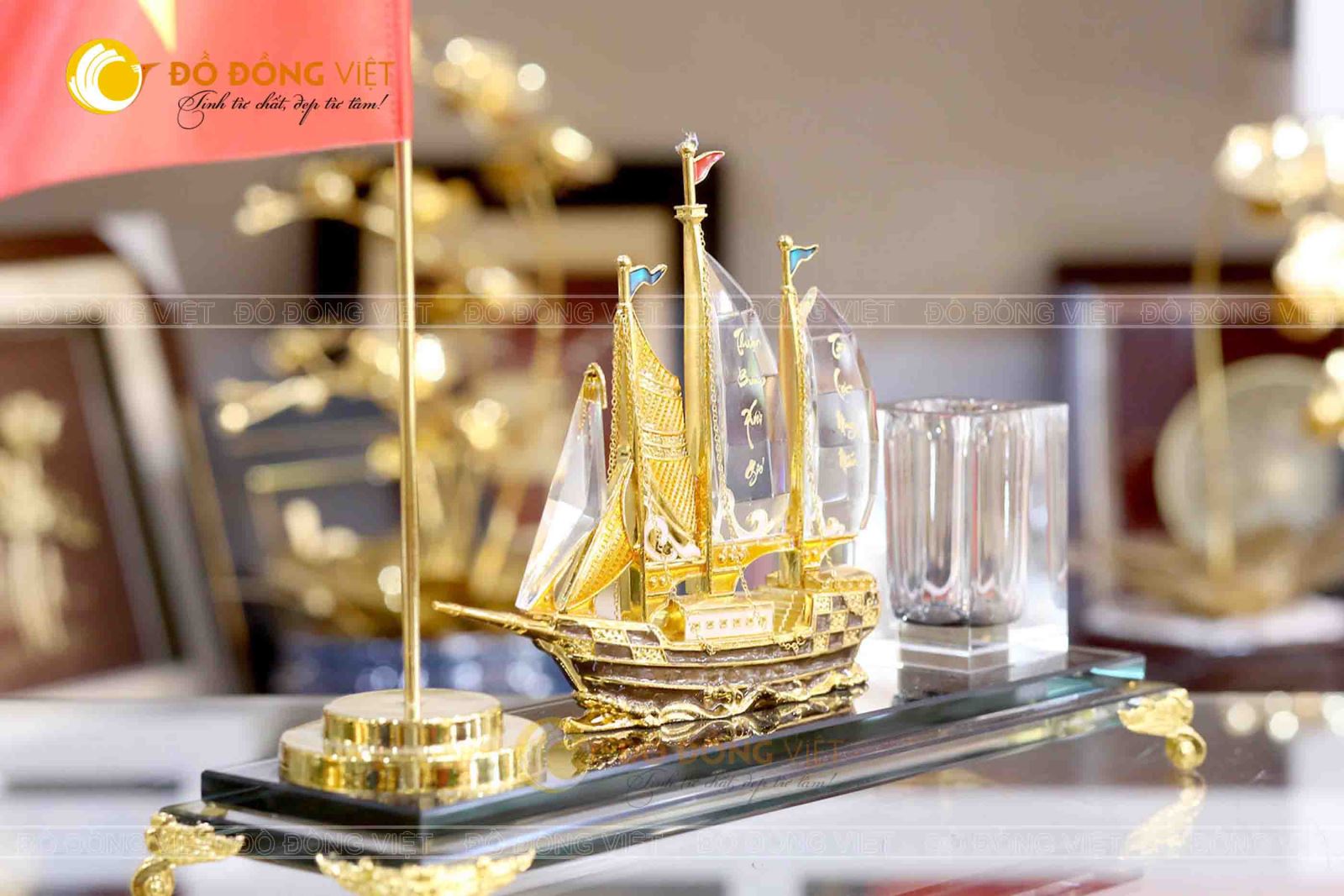 Hình ảnh thuyền buồm – thuận buồm xuôi gió được xem như biểu tượng thành công cho những người làm ăn kinh doanh. Mang ý nghĩa với nhiều cuộc giao dịch tốt đẹp và thu về nhiều lợi nhuận. Sự kết hợp của mô hình thuyền buồm mạ vàng và giá cắm bút của Đồ đồng Việt là một thiết kế mới sáng tạo và độc lạ hơn hẳn. Chiếc giá bút mạ vàng cao cấp sẽ là món quà rất lý tưởng để làm quà tặng cũng như sử dụng.