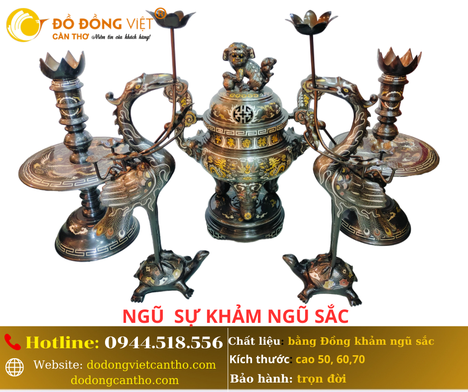 Ngũ sự khảm ngũ sắc là bộ sản phẩm thờ cúng cao cấp gồm: đỉnh thờ, đôi hạc, đôi chân nến. Được chế tác thủ công tinh xảo trên nền đồng nguyên chất, kết hợp khảm 5 kim loại quý hiếm (vàng 9999, bạc, đồng đỏ, đồng xanh, đồng đen), sản phẩm toát lên vẻ sang trọng, đẳng cấp vượt thời gian.