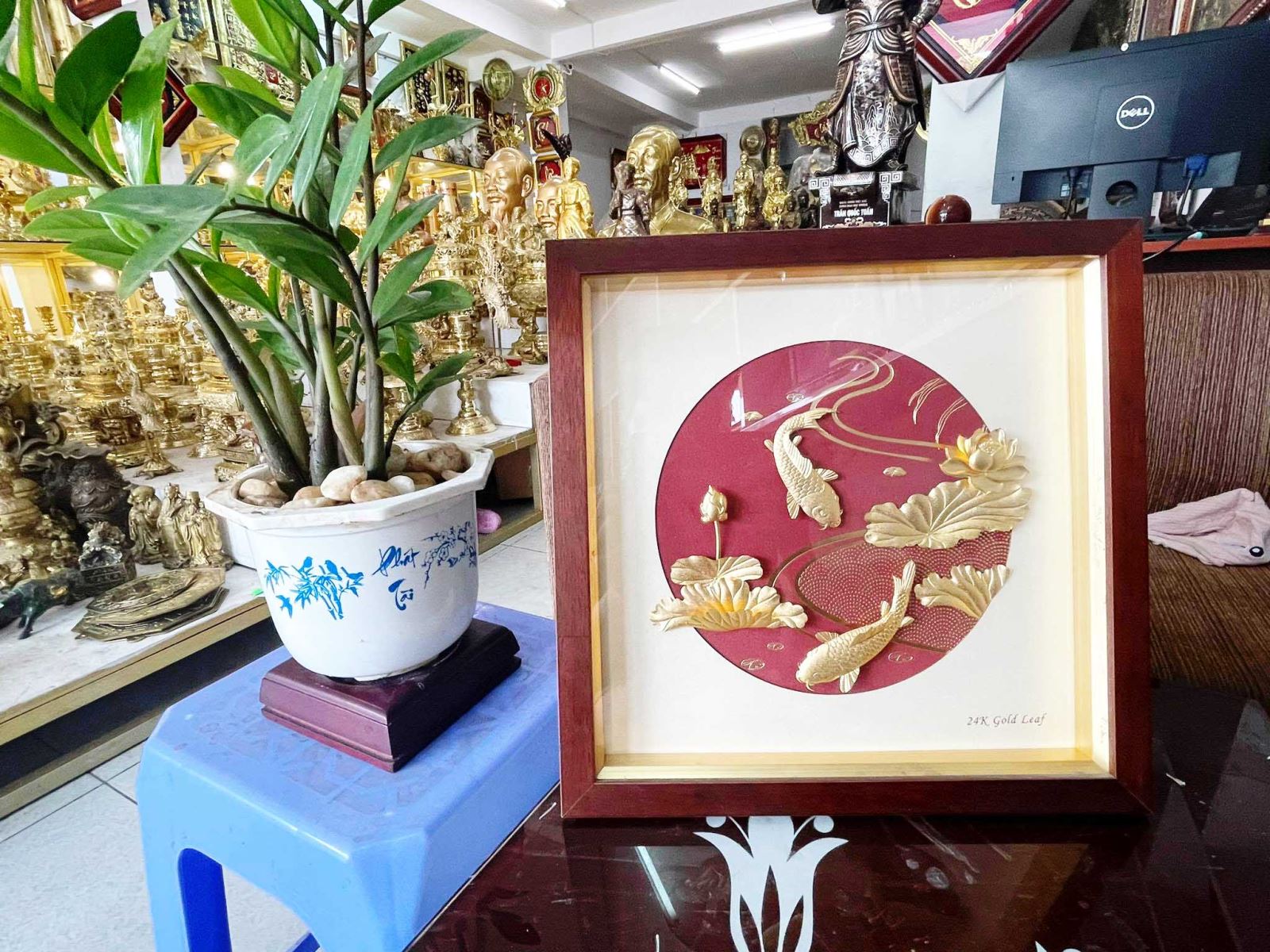 Tranh cá chép hoa sen dát vàng 24k được chế tác từ những bàn tay nghệ nhân tài hoa và khéo léo. Bức tranh nổi bật với hình ảnh chủ đạo của cá chép quây quần bên những đóa sen vàng đang nở rộ. Sản phẩm ấn tượng với người nhìn bởi đường nét hoa văn vẽ hình thù cá chép, bông hoa sen nhẹ nhàng, sinh động. Đặc biệt hơn biểu tượng cá chép và hoa sen được dát vàng, mạ vàng 24k sáng bóng và tinh tế đến chừng chi tiết.