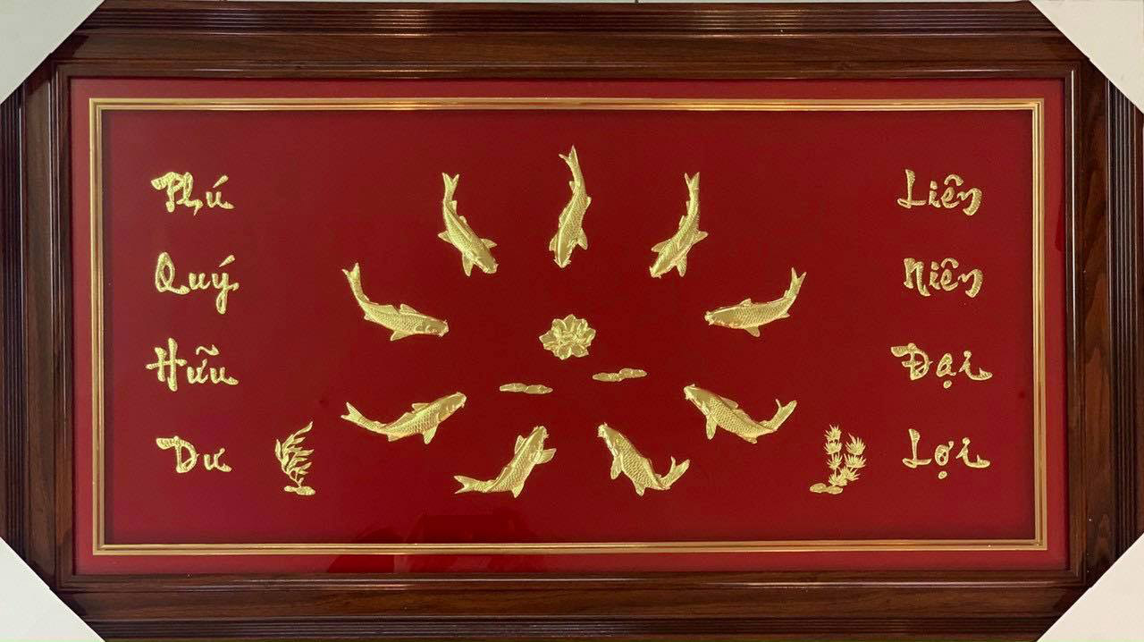Bức tranh Cửu ngư quần hội với hình ảnh chín con Cá chép, hoa sen là biểu tượng cho sự dư dả dài lâu, sự sung túc, tài lộc dồi dào.