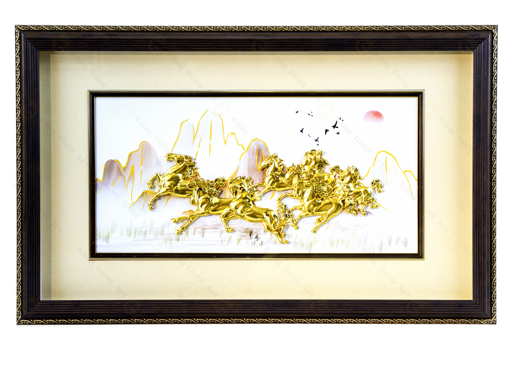Tranh vàng mã đáo thành công được chế tác trên chất liệu vàng 24K, càng tôn lên phong thái hiên ngang, oai hùng của từng chú ngựa.