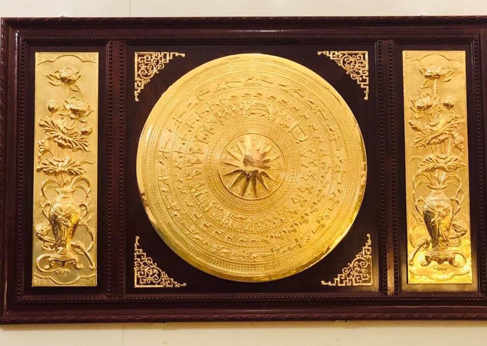 Trên đây là hình ảnh tranh mặt trống đồng gò theo mô hình mặt trống Đông Sơn đẹp từng chi tiết với kích thước có sẵn 80cm được mạ vàng 24k đẹp sang trọng.