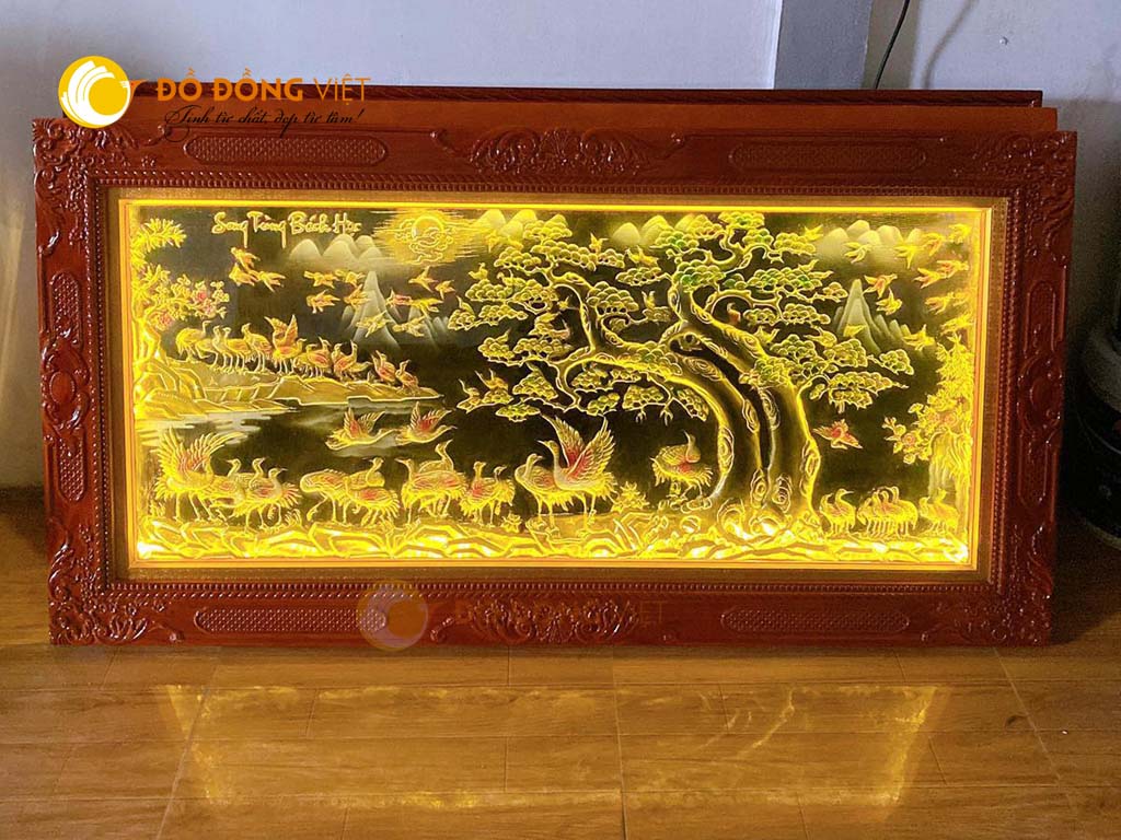 Tranh bách hạc song tùng được chế tác hoàn toàn thủ công từ nguyên liệu đồng vàng nhập khẩu Hàn Quốc, loại đồng tiêu chuẩn dày 8rem. Khung tranh được làm bằng loại gỗ gụ cao cấp đủ để giữ bức tranh yên vị trên tường mà không sợ bị nứt nẻ vì được xử lý gỗ trước khi cho hoàn thiện.