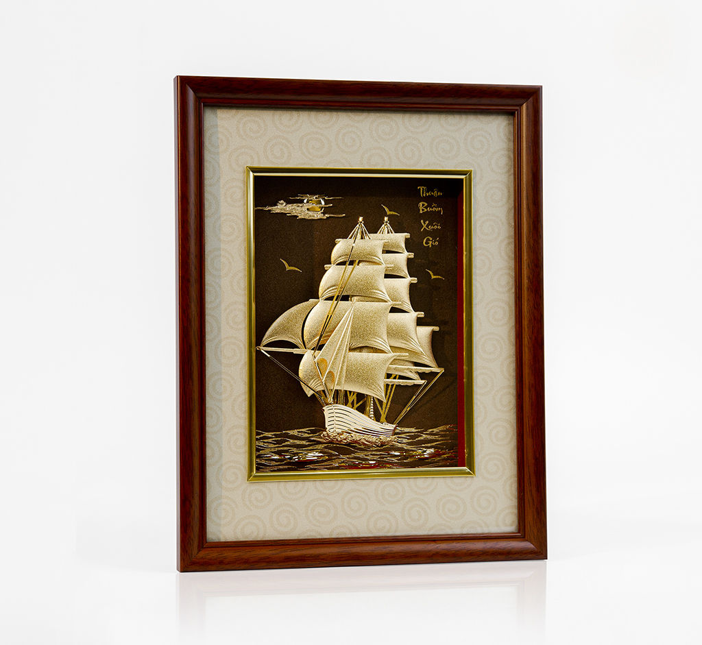 Tranh Thuyền Buồm Bằng Vàng sử dụng hình ảnh con thuyền đang căng buồm lướt sóng trên mặt nước tiến lên phía trước với sự kết hợp từ chất liệu chính là Vàng 24K. Vốn là biểu tượng có giá trị phong thủy rất cao.