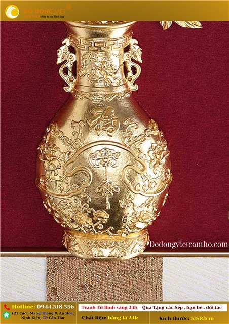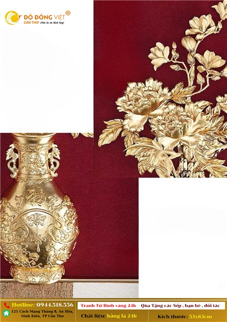 - Chất liệu cao cấp: vàng 24K tinh xảo. Kích thước đa dạng: 53x83cm hoặc đặt làm theo yêu cầu. Thiết kế: Chạm khắc tỉ mỉ, từng chi tiết hoa văn sắc nét. Màu sắc: Vàng 24K sang trọng, quý phái, bền đẹp theo thời gian.