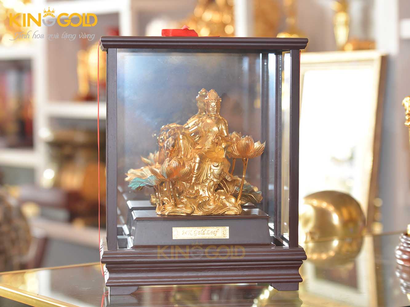 Tượng Văn Thù Bồ Tát được đúc thủ công tại xưởng đúc đồng và xưởng mạ vàng của Đồ đồng Việt. Hình ảnh tượng Phật ngồi trên sư tử tọa thiền dưới đài sen. Mắt nhìn về phía bầu trời như soi đường chỉ lối về phía tây phương cực lạc. Một tay ngài buông lơi hơi thõng.